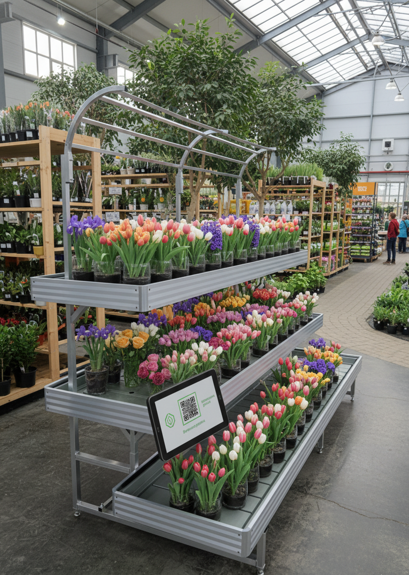 Ключевым элементом здесь выступает цветочная витрина и торговые стеллажи. Оборудование от «Витрина роста» позволяет создавать многоуровневые композиции, которые просматриваются со всех сторон. Использование столов с «ваннами» для затопления (система «прилив-отлив») гарантирует свежесть цветка, а значит — минимизирует списания. Визуальная чистота линий алюминиевого профиля не отвлекает внимание от товара, а подчеркивает природную красоту растений.