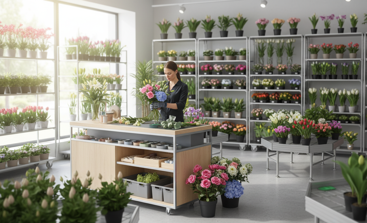 Когда в кадр попадает профессиональное, чистое, блестящее оборудование, это подсознательно повышает доверие к качеству цветов. Ржавые стойки или кустарные деревянные полки могут испортить впечатление даже от самого роскошного букета. Красивая «картинка» рабочего пространства повышает вовлеченность и конвертирует подписчиков в покупателей.
